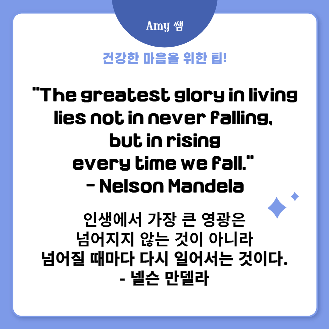 "인생에서 가장 큰 영광은 넘어지지 않는 것이 아니라 넘어질 때마다 다시 일어서는 것입니다." - 넬슨 만델라