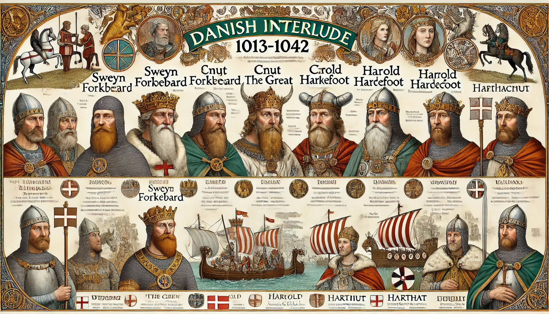 덴마크 왕조 중간기(1013-1042)는 덴마크 왕들이 영국을 통치한 중요한 시기로, 영국의 문화와 정치 지형에 큰 영향을 미쳤습니다. 스벤 포크비어드의 짧은 정복은 그의 아들 크누트 대왕이 넓은 북해 제국을 건설하는 계기가 되었으며, 크누트는 영국에 안정과 번영을 가져왔습니다. 해럴드 하레푸트와 하드크누트는 뒤이어 통치하였으며, 특히 하드크누트의 통치 기간 동안 에드워드 고백왕의 복귀가 이루어져 영국 왕조의 부활을 준비했습니다. 이 시기는 중요한 전투, 결혼을 통한 동맹, 권력 투쟁이 빈번했던 시기였습니다.